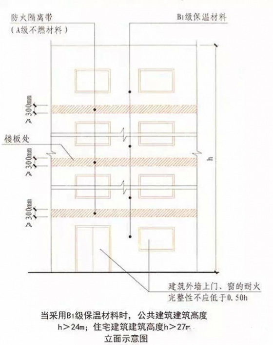 4.當(dāng)建筑的外墻外保溫系統(tǒng)采用燃燒性能為B1、B2級(jí)的保溫材料時(shí),除采用B1級(jí)保溫材料且建筑高度不大于24米的公共建筑或采用B1級(jí)保溫材料且建筑高度不大于27米的住宅建筑外,建筑外墻上門(mén)、窗的耐火完整性不應(yīng)低于0.5小時(shí)。