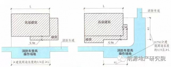 1)高層建筑應(yīng)至少沿一個(gè)長(zhǎng)邊或周邊長(zhǎng)度的l/4且不小于一個(gè)長(zhǎng)邊長(zhǎng)度的底邊連續(xù)布置消防車(chē)登高操作場(chǎng)地,該范圍內(nèi)的裙房進(jìn)深不應(yīng)大于4米;