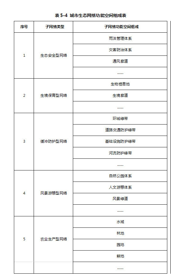 按照生態(tài)網(wǎng)絡功能用途,分別建構(gòu)生態(tài)安全型網(wǎng)絡、生境保育型網(wǎng)絡、緩沖防護型網(wǎng)絡、風景游憩型網(wǎng)絡以及農(nóng)業(yè)生產(chǎn)型網(wǎng)絡五種類型的功能性子網(wǎng)絡。(詳見表5-4)