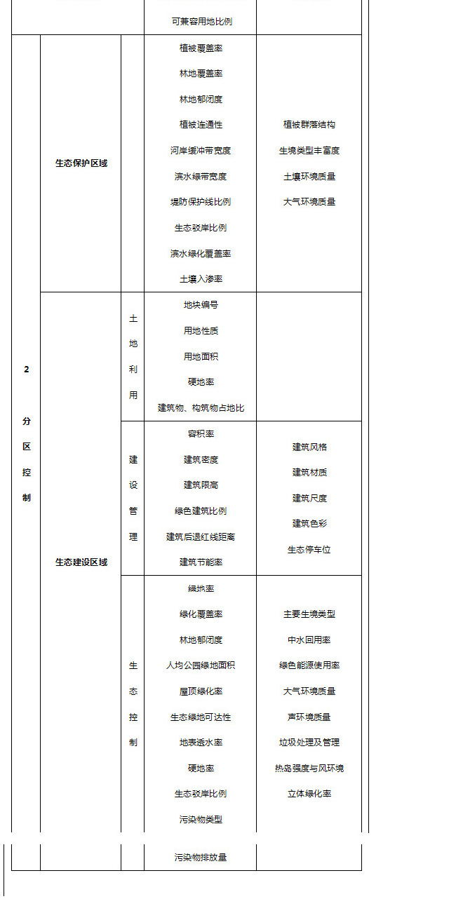 生態(tài)控制類的控制性指標包括綠地率、綠化覆蓋率、林地郁閉度、人均公園綠地、屋頂綠化率、生態(tài)綠地可達性、地表透水率、硬地率、生態(tài)駁岸比例、污染物排放量等;引導性指標包括主要生境類型、中水回用率、綠色能源使用率、大氣環(huán)境質(zhì)量、聲環(huán)境質(zhì)量、垃圾處理及管理、熱島強度與風環(huán)境、立體綠化率等。