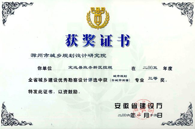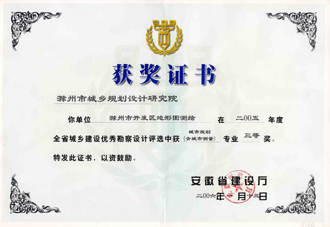 滁州市經開區(qū)地形圖測繪規(guī)劃獲獎證書