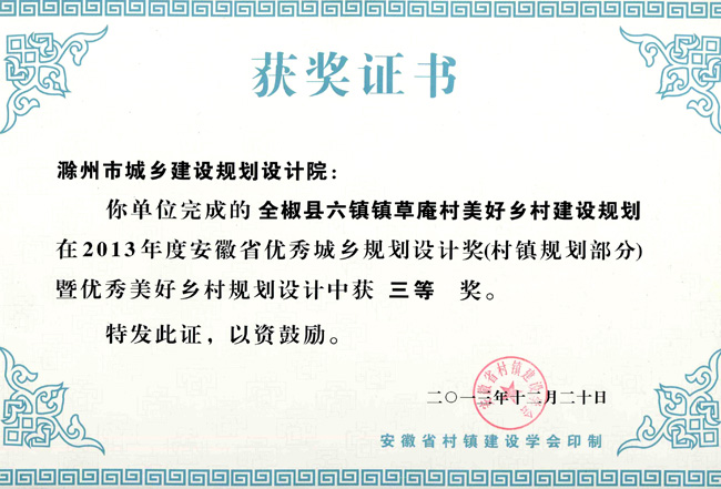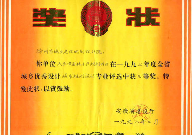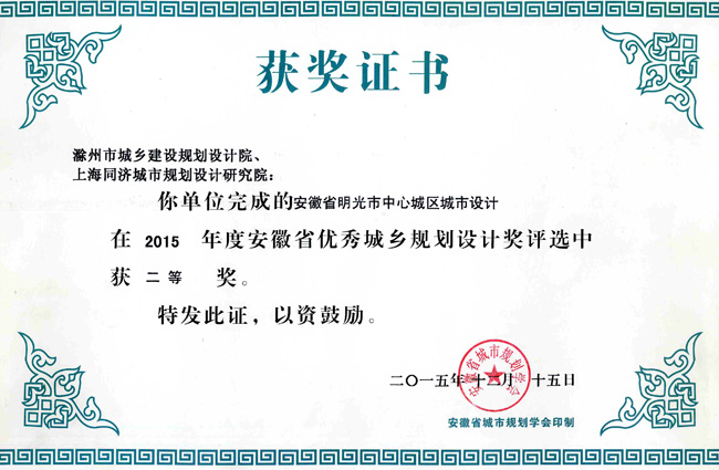 明光市中心城區(qū)規(guī)劃獲獎證書
