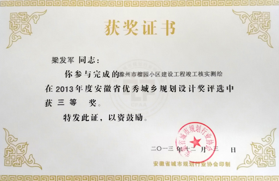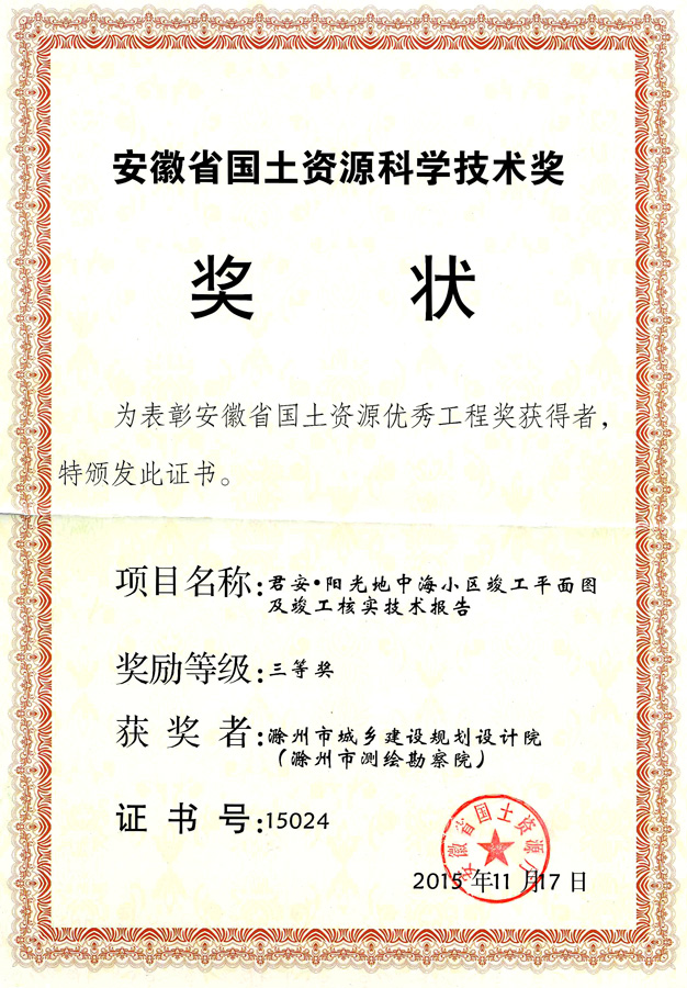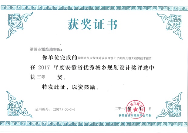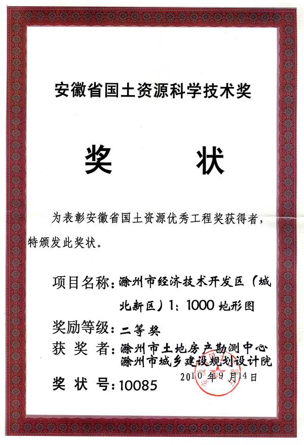 滁州市經(jīng)開區(qū)地形圖測繪規(guī)劃獲獎證書
